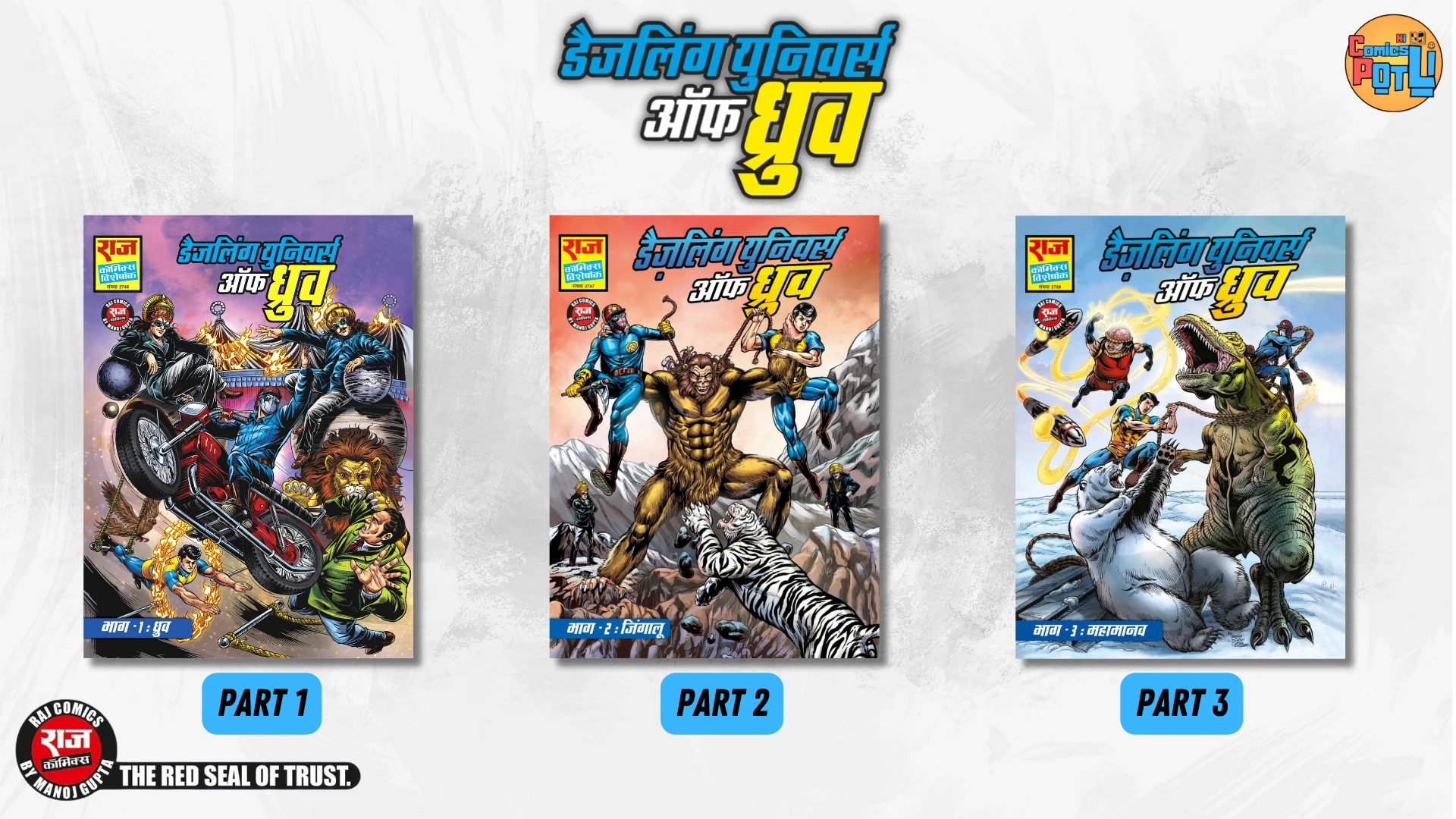 Dazzling Universe of Dhruv. इस कॉमिक्स का मूल महत्वा हैं की क्या होता अगर दुनिया में सुपर हेरोस नहीं होते। जिसकी शुरुआत सुपर कमांडो ध्रुव से हुई। इसका मतलब अगर ध्रुव सुपर कमांडो नहीं बनता। क्या ये संभव हैं ? ये कोशिस अनुपम जी कॉमिक्स के एक पत्र सहमंत के द्वारा कर रहे हैं। वो कुछ बदलाव ध्रुव और कुछ और पात्र के जीवन में करने वाले हैं इस कोसिस में की क्या ध्रुव को सुपर कमांडो बनने से रोका जा सकता हैं क्या । क्या ध्रुव का काम कोई और साधारण इंसान जैसे हर शहर की रक्षा पुलिस फोर्स करती हैं। तो दिल थम कर बैठिये और इन कॉमिक्स का आनद लीजिये फिर से।